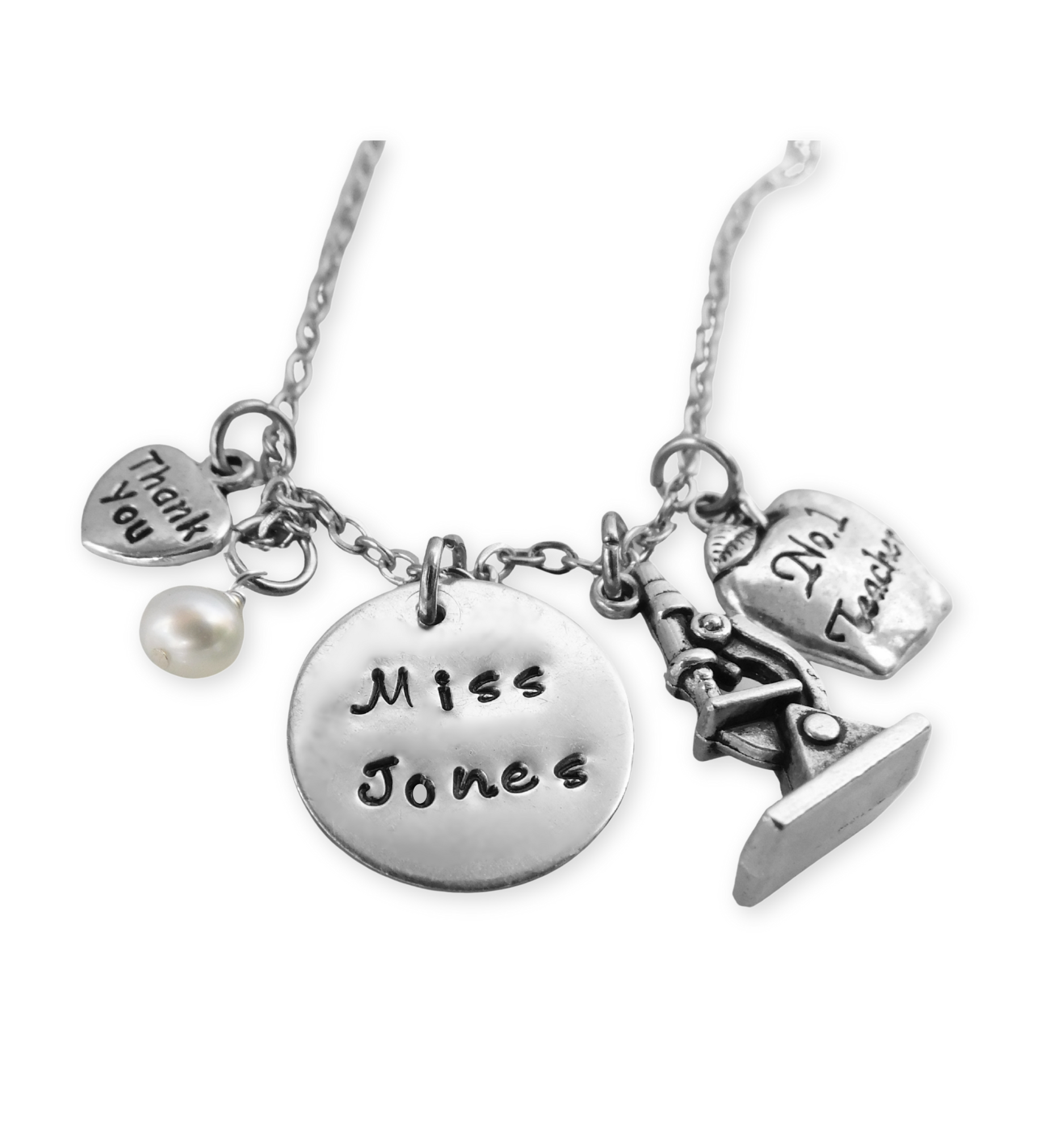 What a beautiful way to thank your teacher! Your choice of 24" long stainless steel necklace or key ring. Includes Thank You charm, Hand Wrapped Cultured Pearl of Wisdom, #1 Teacher Apple charm, Microscope charm and hand stamped custom name on 3/4" shiny pewter pendant. Comes in box with typeset "Thank you for giving me the gift of science."