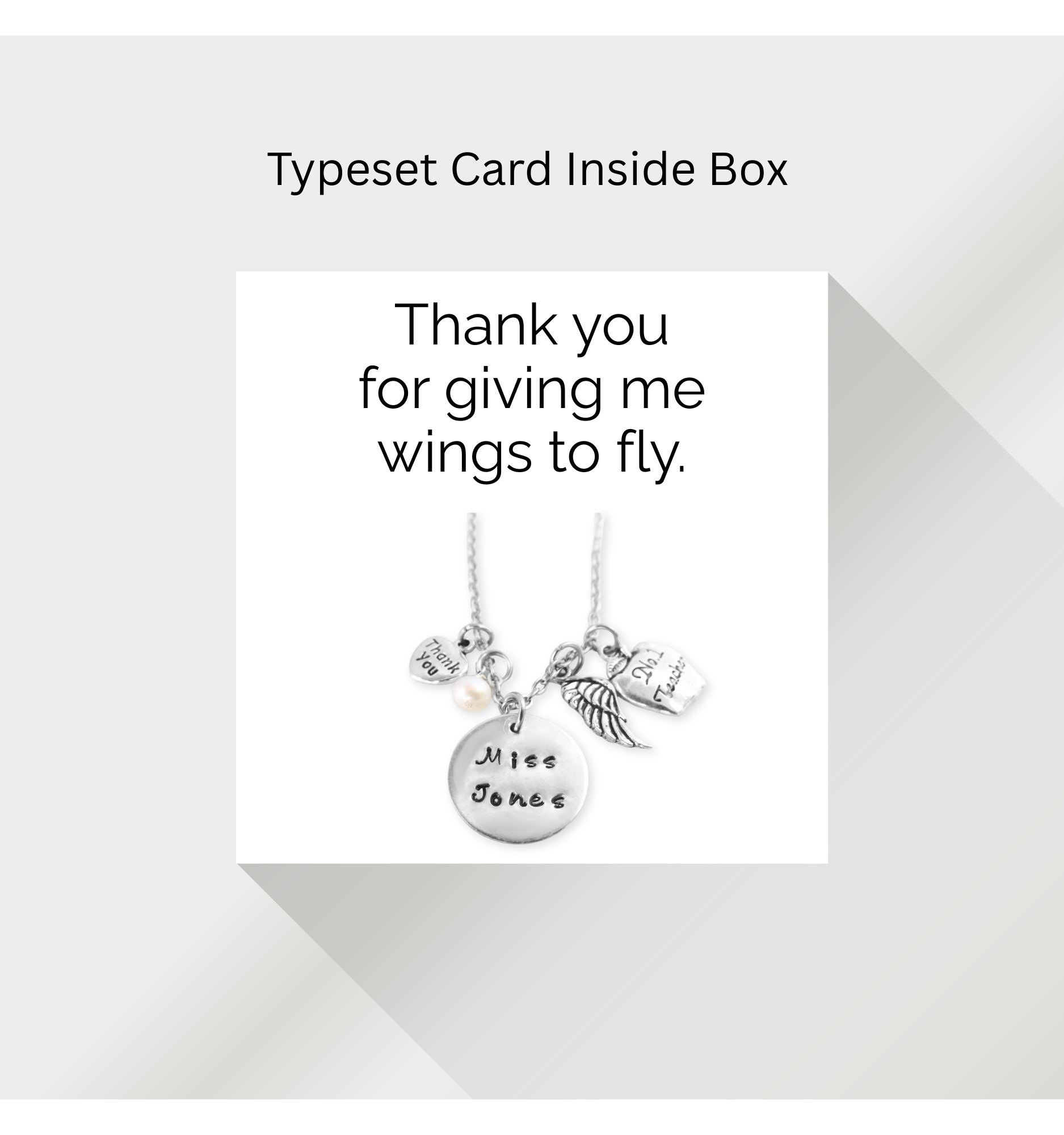 What a beautiful way to thank your teacher! Your choice of 24" long stainless steel necklace or key ring. Includes Thank You charm, Hand Wrapped Cultured Pearl of Wisdom, #1 Teacher Apple charm, Wing charm and hand stamped custom name on 3/4" shiny pewter pendant. Comes in box with typeset "Thank you for giving me wings to fly."